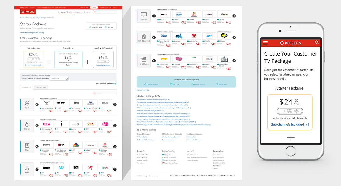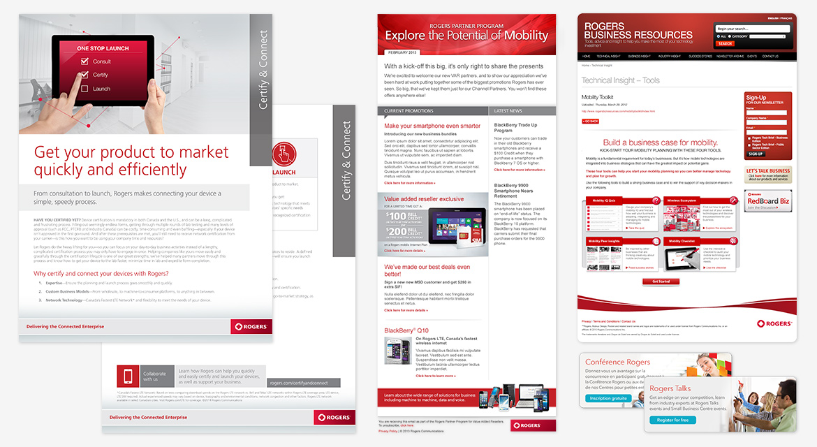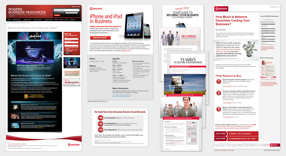 Rogers is one of the "Big Three" telecom companies in Canada and over the years I have been fortunate enough to work on many of their projects from beginning to completion. My work with them has ranged from email campaigns, microsites, print material and additional pages/layout for existing sections and/or sites such as TV Packages for Business and Rogers Enterprise. On many occasions I was brought in mid-stream to offer guidance and insight on the projects for the other designers and developers I worked with due to my experience with Rogers in the past.
